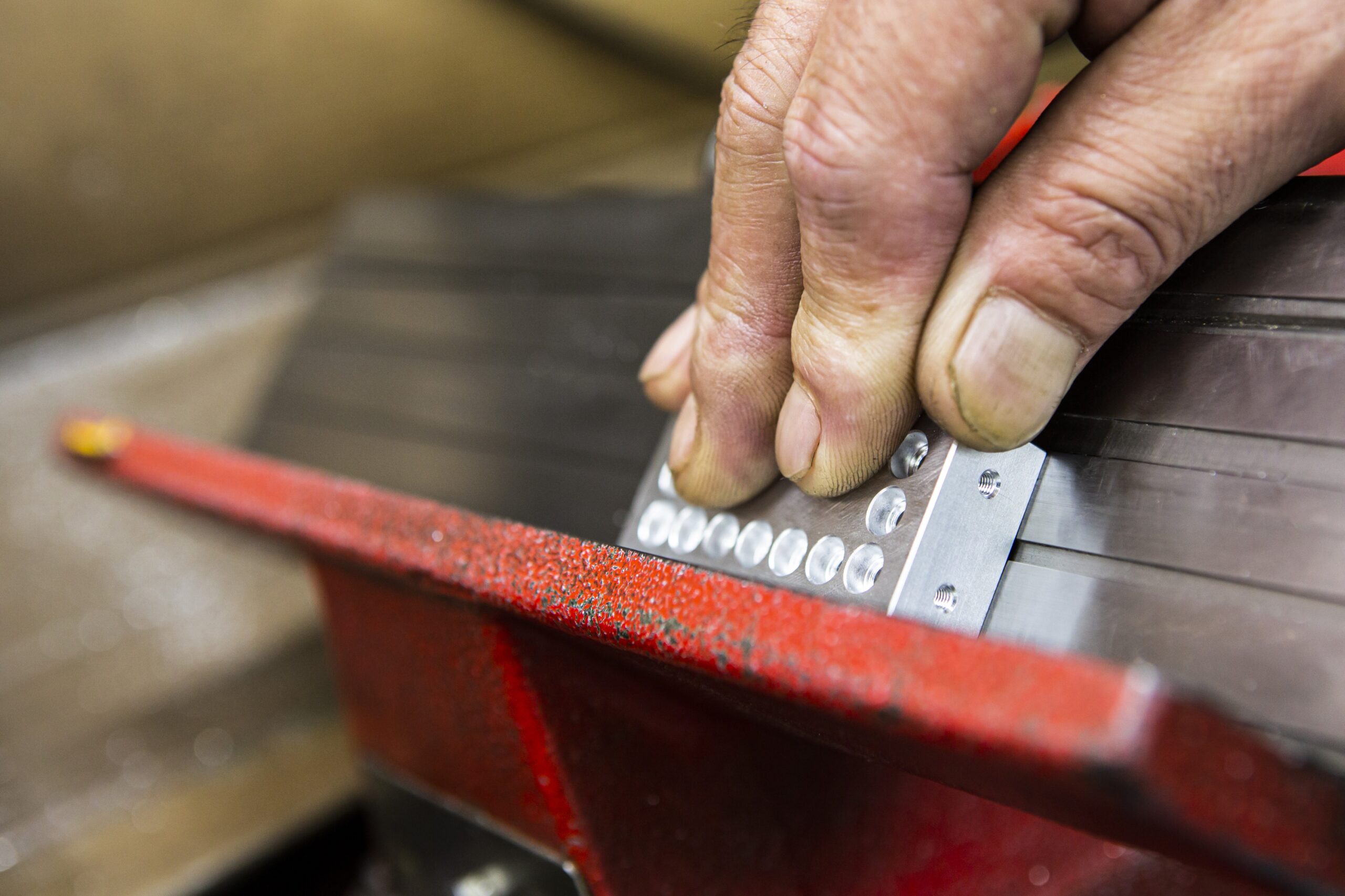 ここから、町工場職人の手わざが発揮されます。ブロックの寸法(スタンダードサイズ:60㎜×30㎜×15㎜)の精度を高めるために、ミクロン単位での削り加工や表面仕上げ(ヘアライン加工)を職人の手で行います。